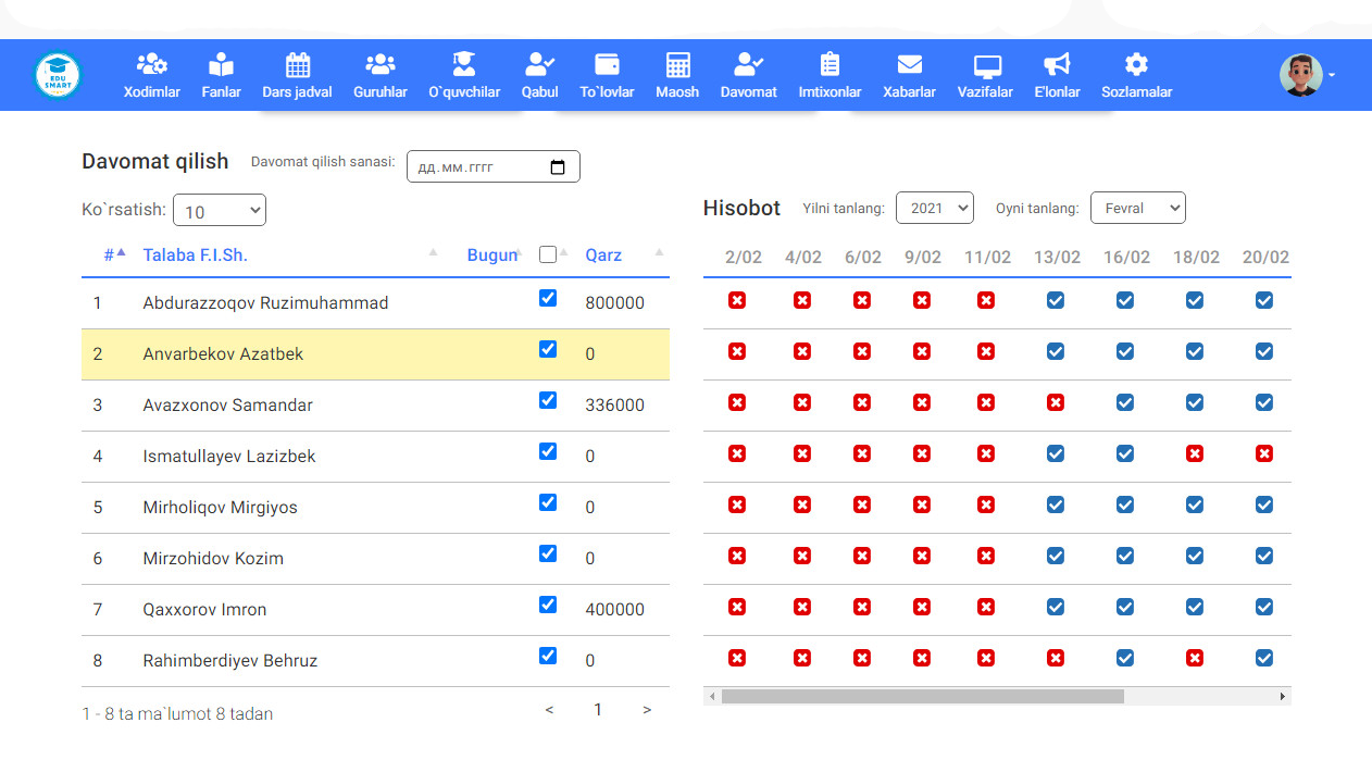 O'quvchilarni dars jarayonlariga qatnashishlarini doimiy belgilab borish hamda hisobotlarni shakllantirish