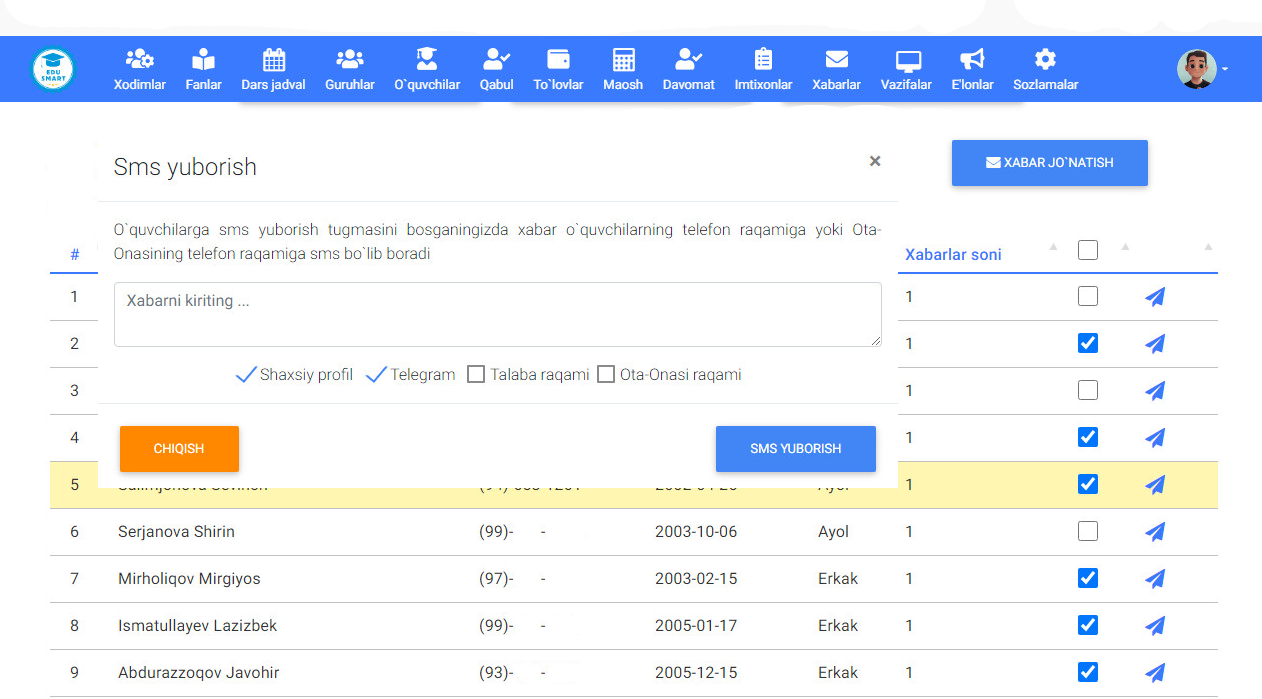 O'quvchilarga oylik to'lovlar, qarzdorlik, imtihon natijalari, tug'ilgan kun va bayramlarda sms xabarnomalar yuborish